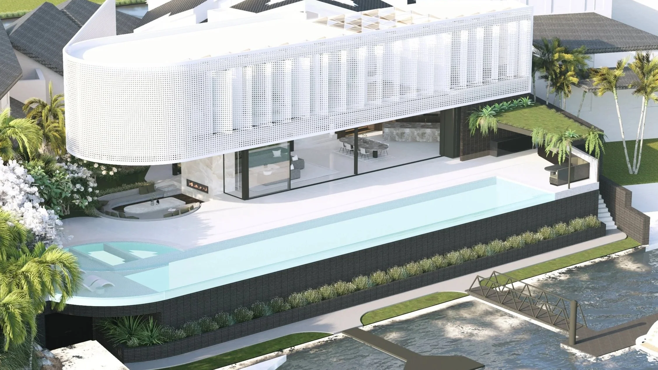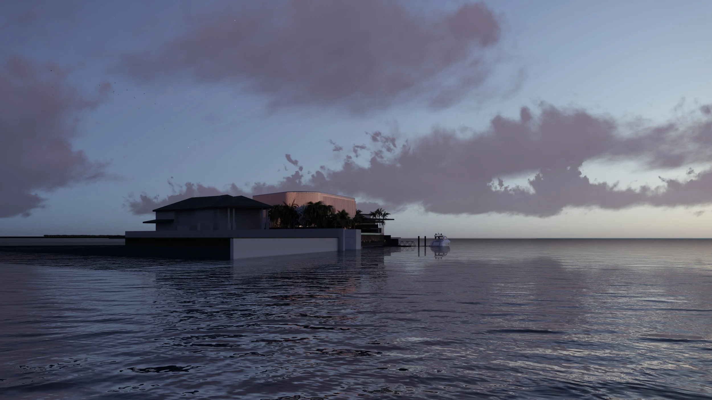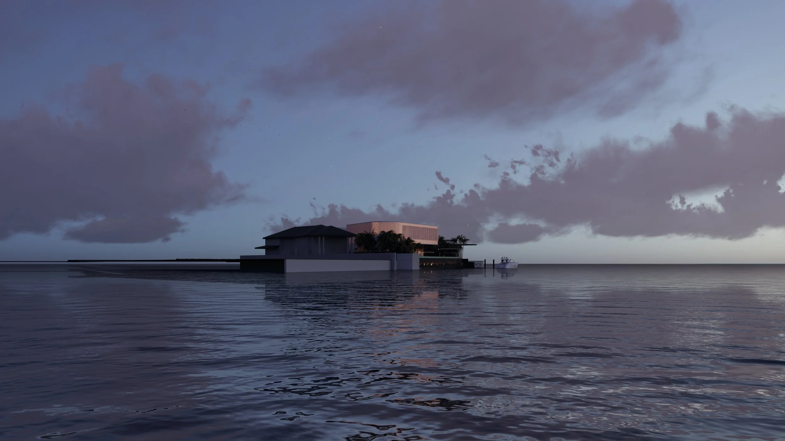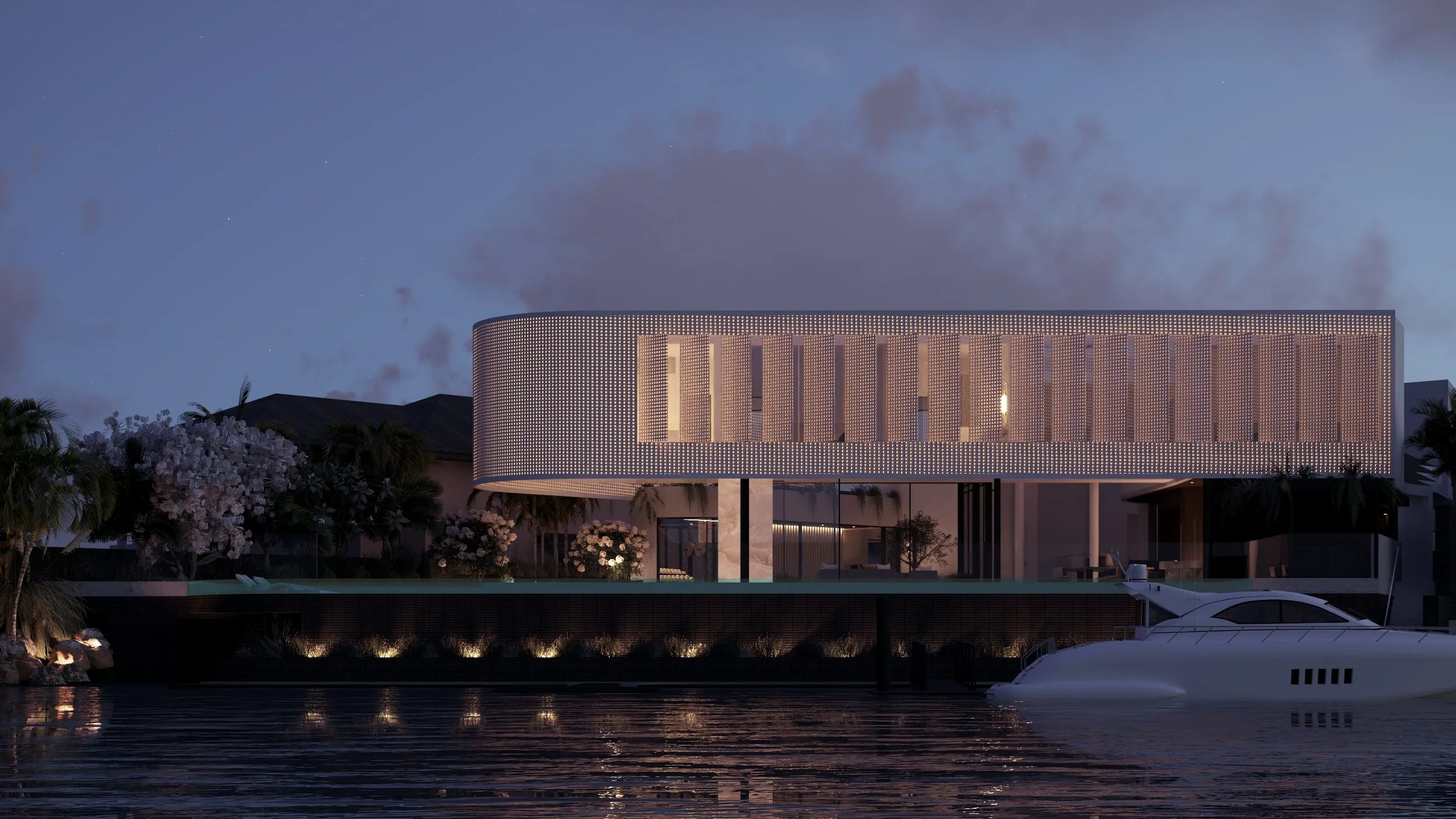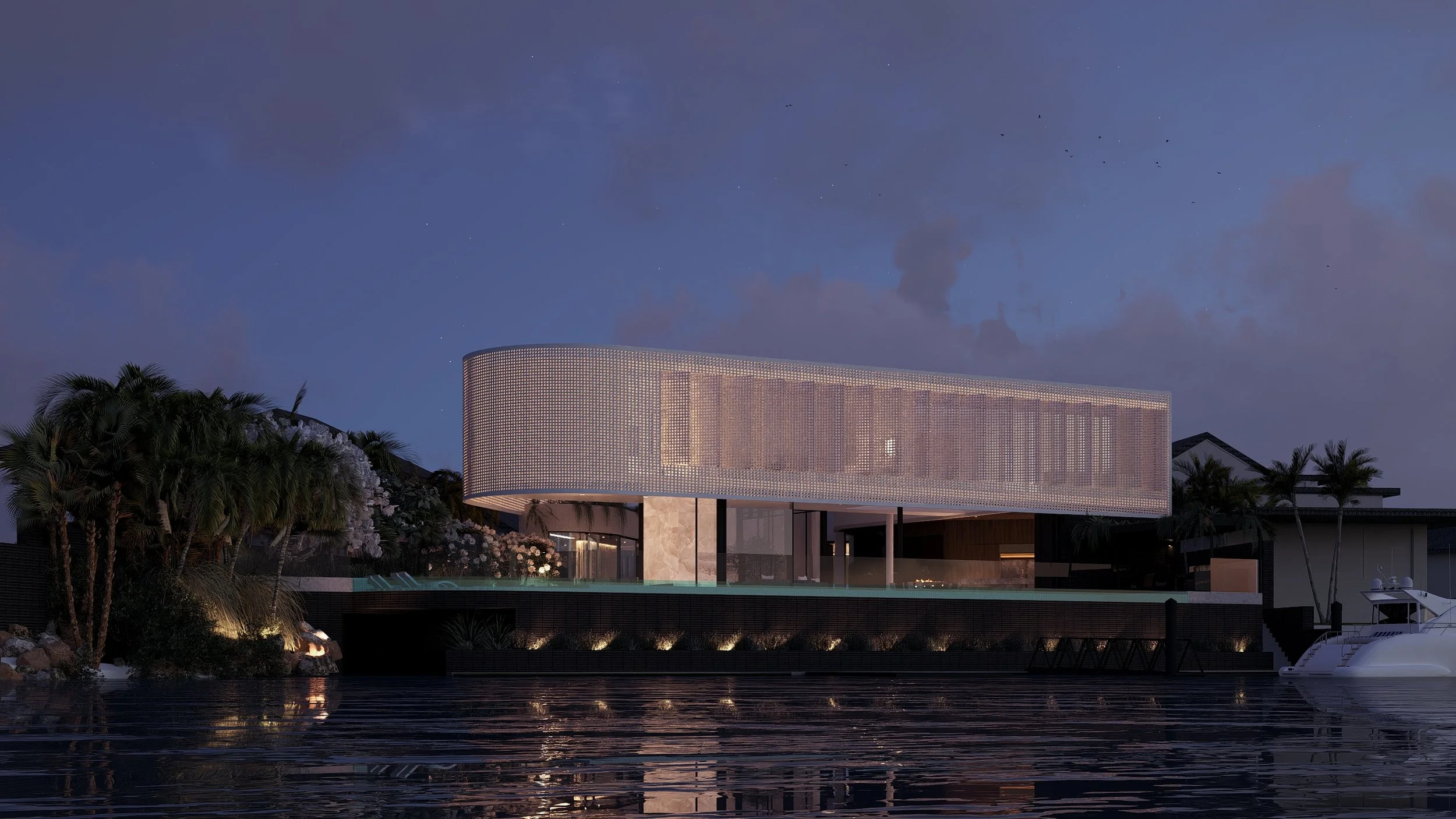 A super modern openable facade creates a sun veil during the day and a lantern on the river at night.